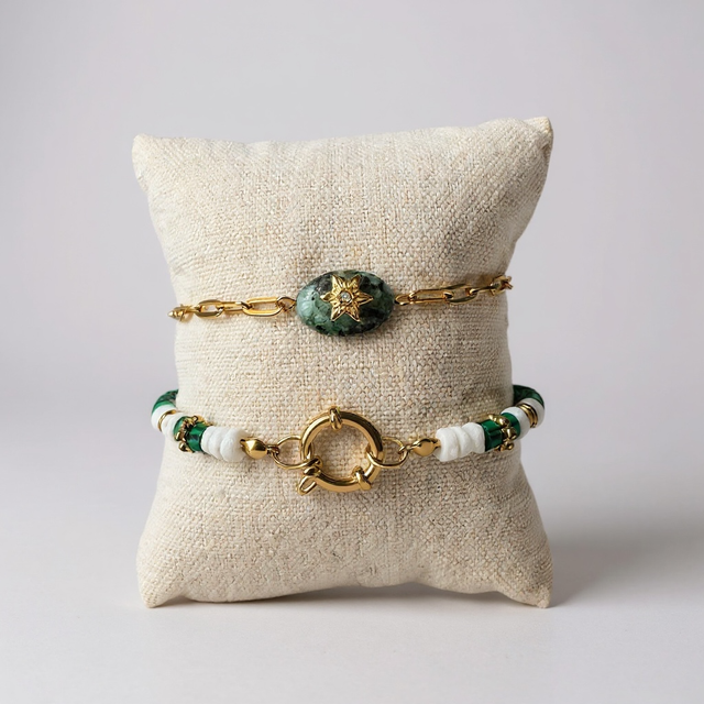 Ajoutez une touche de fraîcheur à votre collection de bijoux avec ce bracelet en acier inoxydable, rehaussé de perles vertes et blanches. Les perles lumineuses, alternant entre des teintes apaisantes de vert et de blanc, créent un contraste élégant qui attire le regard. Le fermoir doré, placé astucieusement à l’avant, ajoute une touche de sophistication et se transforme en un élément décoratif à part entière. Conçu pour durer, ce bracelet allie élégance et modernité, parfait pour compléter vos tenues quotidiennes ou pour sublimer un look plus habillé.