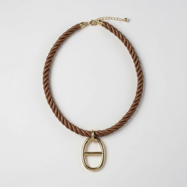 Ce collier audacieux et raffiné associe un cordon épais torsadé marron à une imposante breloque en maille marine dorée. Le design torsadé du cordon apporte une touche de texture et de robustesse, tandis que le pendentif ovale en métal doré, évoquant une ancre marine, ajoute une élégance intemporelle. Ce contraste entre la douceur naturelle du marron et l’éclat doré fait de ce collier une pièce à la fois chic et moderne, idéale pour rehausser n’importe quelle tenue, qu’elle soit décontractée ou plus sophistiquée.